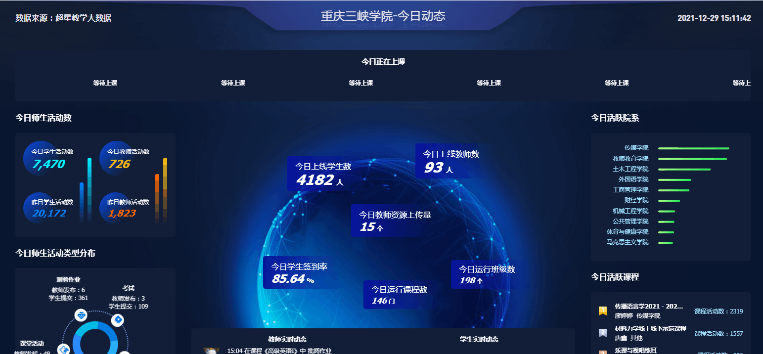 2021年12月27日,120平方米的教学信息服务大厅在博学楼2栋105室建成。这个大厅既可展示教学信息数据,师生可实时查询课表,还可以让学生打印成绩单和办理学籍证明等。一青年教师高兴地说:“这看似一件小事,却解决了长期困扰我们的大事。”