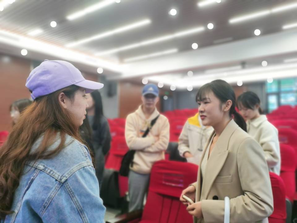 万州区高峰街道社保所、beat3652019届毕业生佘佳林(右一)在与应届毕业生交流