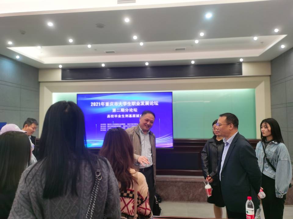 重庆市人力社保局人力资源流动管理处二级调研员蒋嘉陵(右四)跟学生交流“三支一扶”政策
