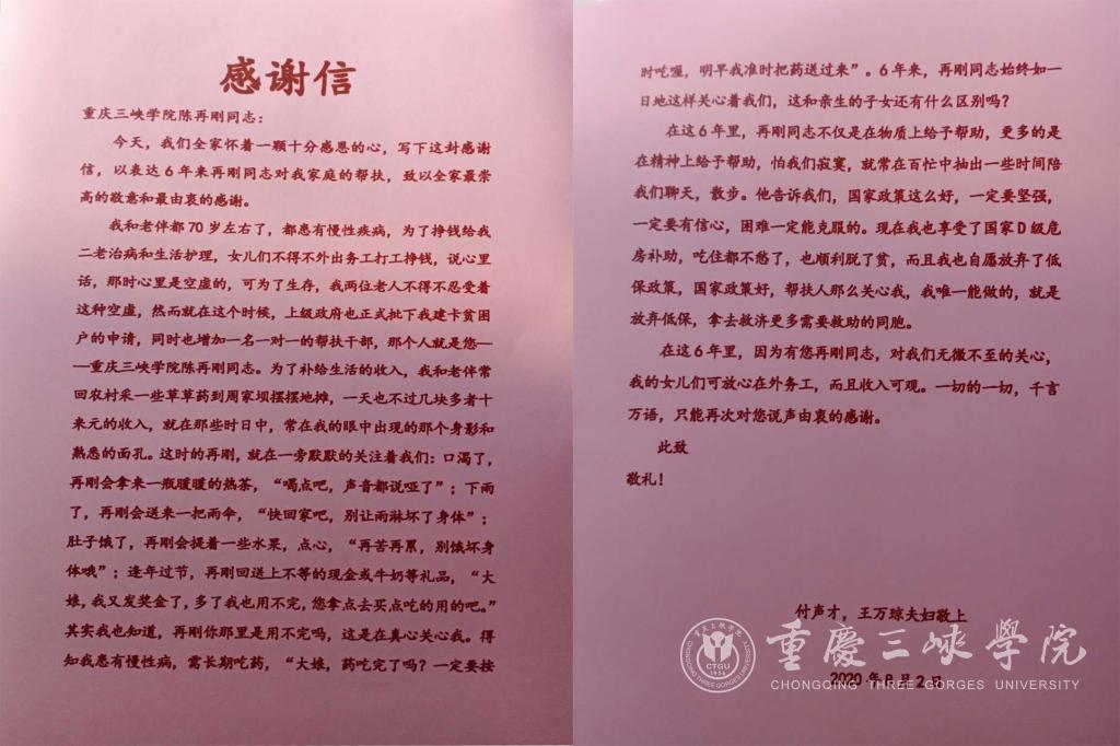 近日,beat365英国官方网站收到一封感谢信,这信封来自分水镇枣园村的付声才、王万琼夫妇,信中表达了对beat365扶贫干部陈再刚同志深深的谢意,感谢他长期以来对老两口的关爱及帮助。