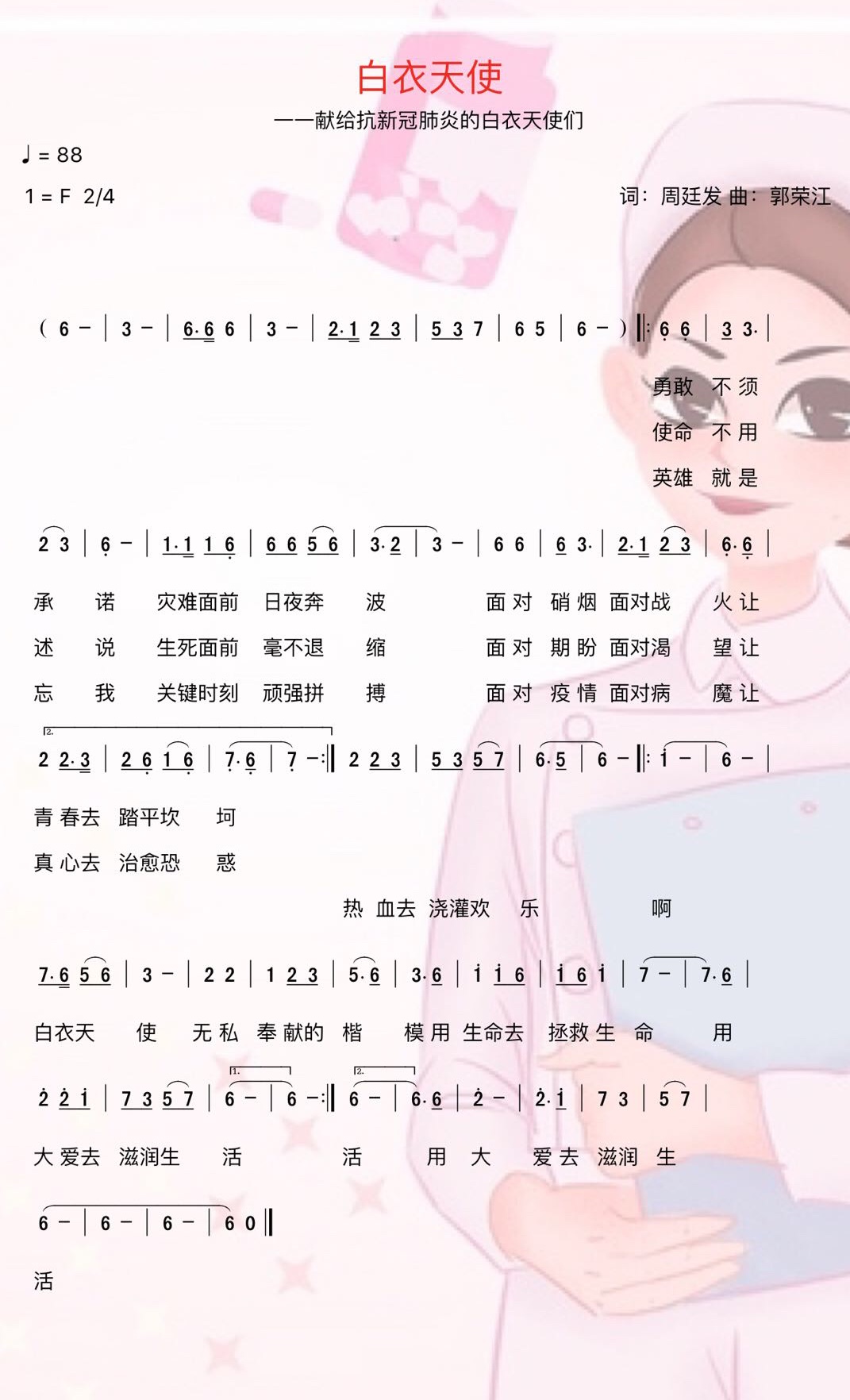 据了解,歌词作者周廷发完成作词后,立即发给了郭荣江老师谱曲,郭老师看后顿觉热情澎湃,使命重大,仅几个小时就创作完成了《白衣天使》的谱曲。