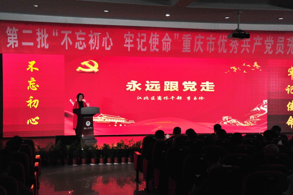 在一片热烈的掌声中,90高龄、拥有71年党龄的李玉珍首先走上讲台,她激情地回顾了1947年加入川东游击队,1948年2月加入中国共产党70余年来一路走过的奋斗历程。几十年来,她以革命烈士为榜样,以共产党人的伟大精神为动力,积极为党工作,热情服务群众。她坚信:“共产党人永远不忘初心、牢记使命永远年轻!”