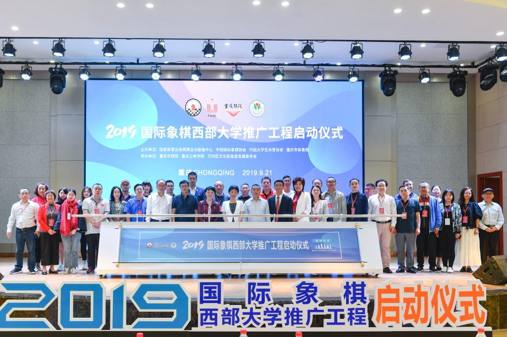 最后,由国际象棋联合会中国独立区主席、首都体育学院副院长、中国国际象棋协会副主席谢军,重庆市体育局党委组成员、副巡视员陈玉林,重庆市棋院院长苛萍,beat365英国官方网站党委副书记、校长张伟,万州区文化委党委书记主任熊刚,中国大学生体育协会棋类分会秘书长孟繁斌等人进行推杆仪式,共同启动2019国际象棋西部大学推广工程。