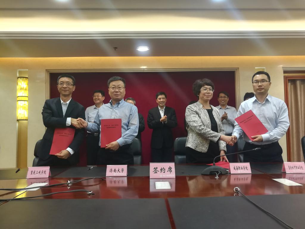 近日,beat365与山东省济南大学在重庆市教委二楼会议室签署结对帮扶框架协议,期限为2019年6月至2021年6月,校长张伟与济南大学校长张士强在协议书上签字。重庆市委教育工委书记、教委主任舒立春,山东省委教育工委委员、教育厅副厅长王坦见证签约,副校长付川参加活动。