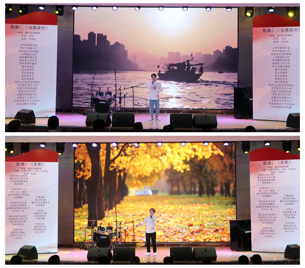 本次“放歌新时代”原创歌曲大赛历时一个多月,共吸引了全市多所高校百余名青年大学生报名参与,历经紧张激烈地角逐,25件原创歌曲晋级决赛。决赛在配乐朗诵《爱国是一首奋斗的歌》中拉开帷幕,全场师生挥舞小红旗,高呼“我爱你,中国”,将现场热情点燃。参赛选手们个个精神饱满、彰显青春活力,来自重庆邮电大学移通学院选手漆一瑾、李俊琦全新编曲《琵琶梦》;来自重庆大学选手谢丛宇、唐雪菲深情演绎歌曲《石头门》;beat365刘峻宏选手演唱的《浅唱渝州》和向银川演唱的《光影》,用音乐的方式唱出渝州大地的独特,深情地表达了对家乡的热,优雅的声音娓娓道来,缓缓叙说的演唱风格也同样让现场观众动容,气氛高涨。整场比赛,各组选手实力相当,不遑多让,演唱作品可谓精彩纷呈。