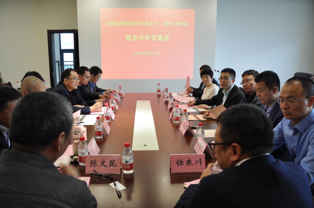 4月21日上午,成都迪康药业股份有限公司董事长任东川一行来校洽谈合作,副校长陈文昆、付川接待任东川一行。