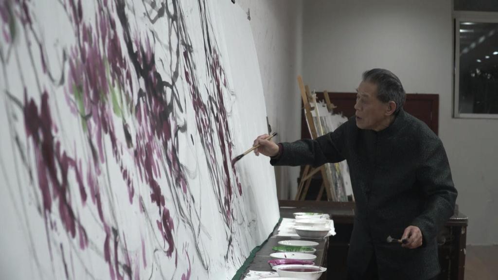 接着,《梁祝》小提琴协奏曲响起,82岁高龄的方凤富凝神静气,手握画笔,走近早已铺好的宣纸,随飘飞的乐曲应节挥毫。