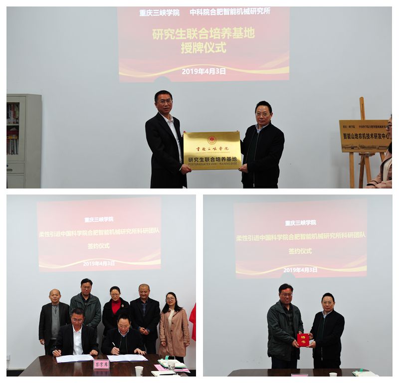 4月3日,学校在慎思楼6栋301会议室举行了柔性引进中科院合肥智能机械研究所科研团队合作协议签字暨共建智能山地农机研发中心揭牌仪式。中科院合肥智能机械研究所综合办主任刘善文、研究员孙丙宇,学校副校长谭明术、人事处处长黎平、科研处处长谭泽富、机械工程学院院长王海宝及相关人员出席仪式。