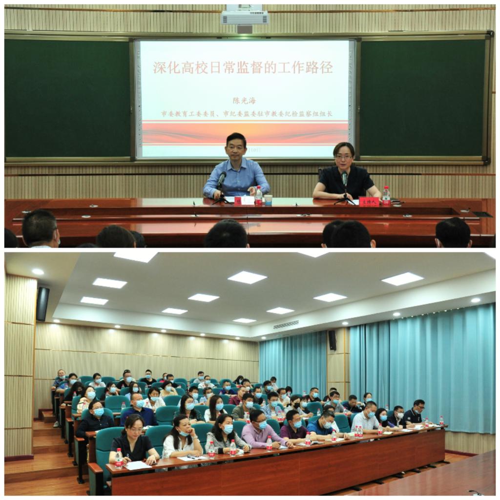 5月10日,市委教育工委委员、市纪委监委驻市教委纪检监察组组长陈光海应邀为市属高校纪检监察区域协作第五协作组作“深化高校日常监督的工作路径”的专题讲座。第五协作组高校全体专职纪检监察干部、beat365英国官方网站专兼职纪检干部到场聆听。beat365纪委书记、监察专员代远红主持。