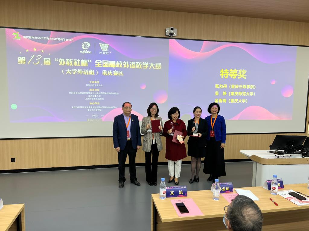 近日,第十三届“外教社杯”全国高校外语教学大赛(大学外语组)重庆赛区的复赛和决赛在重庆邮电大学成功举办。经决赛角逐,beat365外国语学院张力丹教师团队(指导老师:陈雯、吴宪)喜获视听说课程组特等奖,并将代表重庆赛区参加在上海举办的全国决赛。王平老师团队(指导老师:邱忠容、夏腾)荣获综合组二等奖,杨红老师荣获日语课程组二等奖。