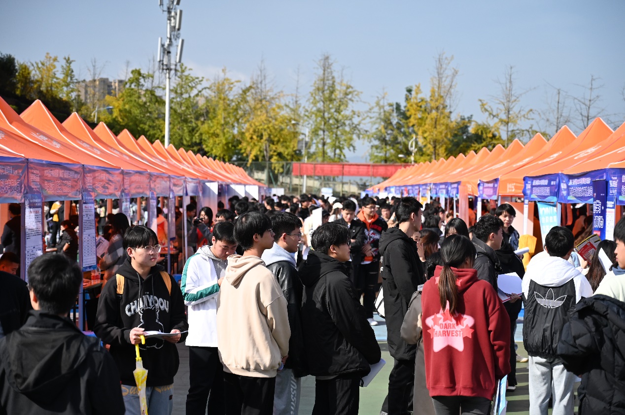 招聘会上,来自长安跨越、诗仙太白、宗申动力、博赛矿业等近150家优质民营企业进场招聘,900余家民营企业参与线上招聘,岗位需求不仅涉及高分子材料、机械制造、生物医药、金融管理、行政管理、餐饮等传统行业,也涵盖节能环保、新能源、新兴信息产业等战略性新兴行业,为广大毕业生提供优质岗位约11200个。每个企业展位前都围满了前来应聘的学生,企业招聘人员对学生们咨询的公司现状、岗位要求、薪资待遇等问题,进行当场解答,气氛热烈、秩序井然。