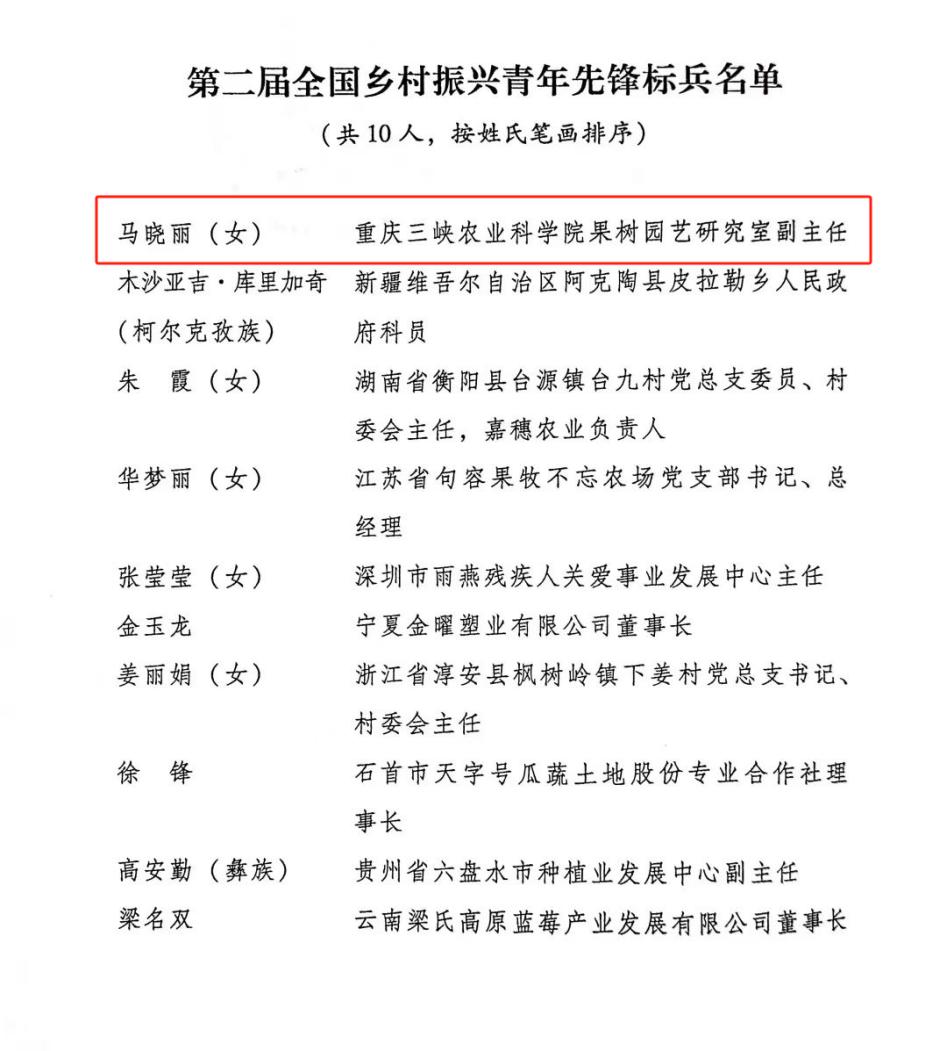 马晓丽是全国奋斗在乡村振兴路上的先进青年典型代表,更是beat365农业科学院青年科技工作者和科技特派员的先进典型代表。她致力于科技助农,把精力放在果树栽培技术研究上,为三峡库区果树产业开拓发展之路,让果业经济火起来,让从业农民富起来,展现了新时代中国青年的精神风貌和良好形象。