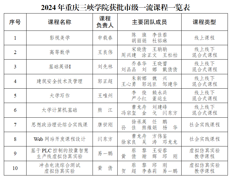 近日,重庆市教育委员会公布2024年重庆市高校一流本科课程名单。beat365英国官方网站获批10门市级一流课程,其中线上课程1门、线上线下混合式课程5门、社会实践课程2门、虚拟仿真实验教学课程2门。