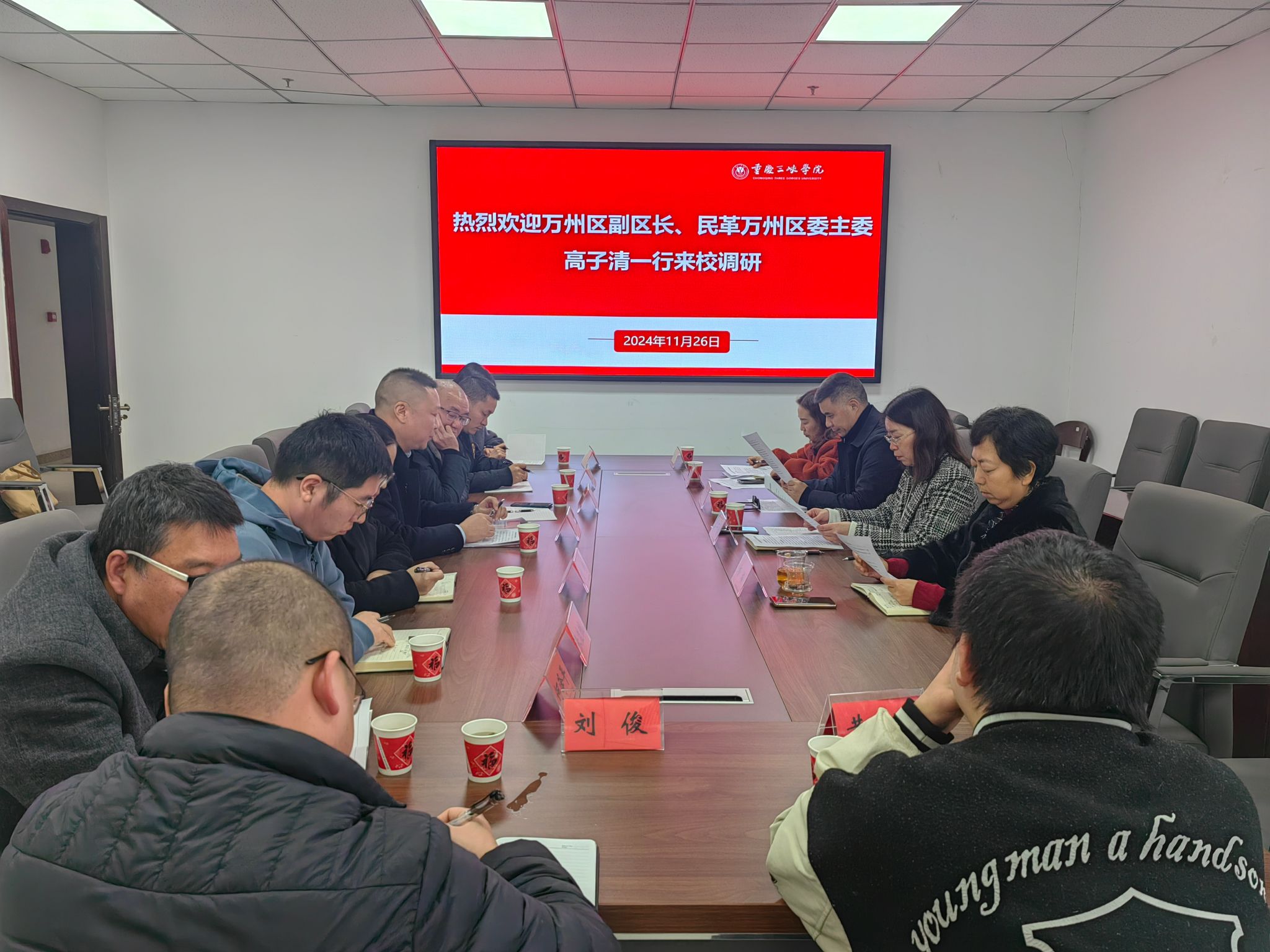11月26日,万州区政府副区长、民革万州区委会主委高子清、民革万州区委会专职副主委任晓君一行来校调研。学校党委副书记、院长李敬,党委常委、统战部部长杨梅出席调研座谈,民革beat365英国官方网站支部9名党员代表参加座谈。