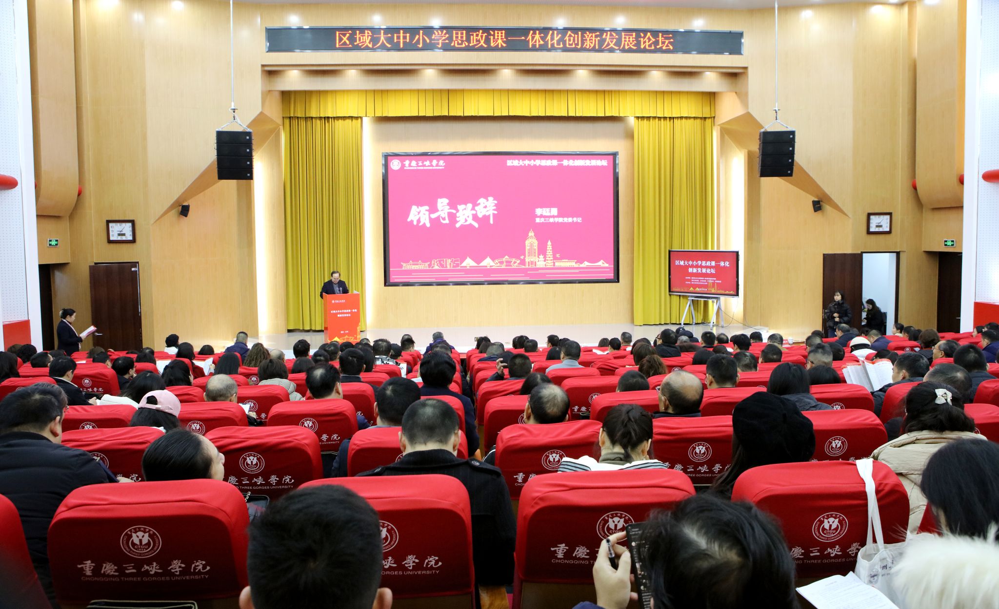 本次论坛由beat365英国官方网站、万州区教委、开州区教委、云阳县教委共同主办,beat365英国官方网站马克思主义学院承办。学校党委书记李廷勇、万州区委副书记郭建伟、学校纪委书记代远红、重庆市大中小学思政课一体化重点建设共同体牵头高校负责人臧小林,以及共同体成员单位负责人、在万高校马克思主义学院负责人、区域内各中小学分管德育领导、大中小学思政课教师代表、学生代表逾200人齐聚beat365,共襄盛宴。论坛由马克思主义学院院长徐承英主持。