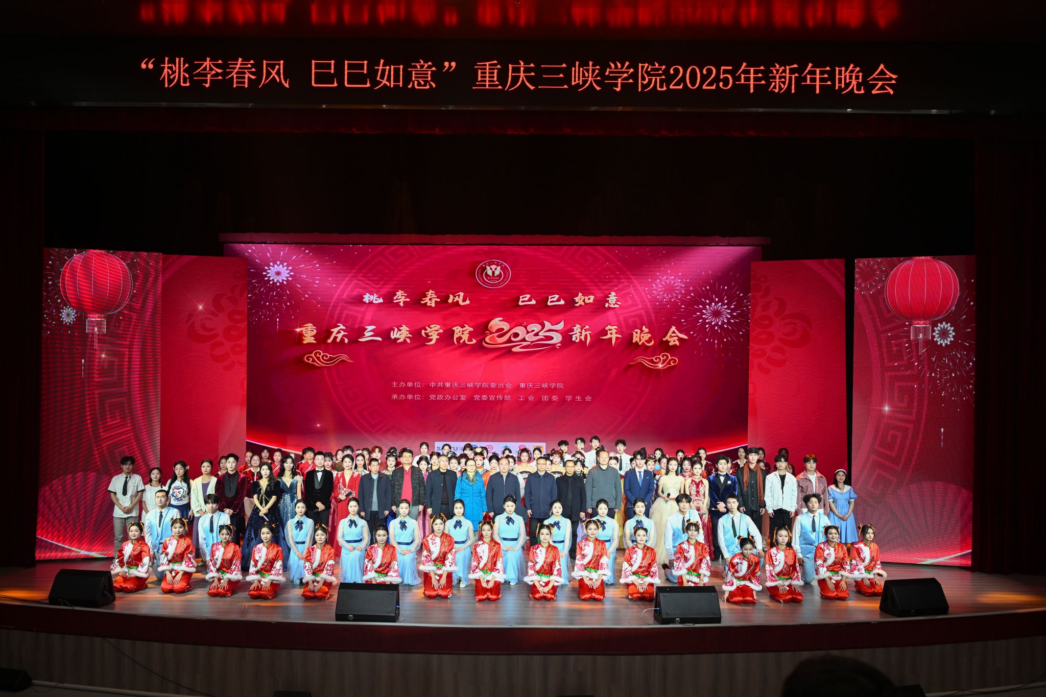 12月29日晚,beat365英国官方网站“桃李春风,巳巳如意”2025年新年晚会在图书馆报告厅举行。学校党委书记李廷勇等党政领导、万州区委宣传部、区委办公室、区政府办公室、区国资委、区住房和城乡建设委、区机关事务中心、团区委、百安坝派出所、长江水务集团、万州北站、万州机场等驻万单位及区级部门有关人员,与师生们齐聚一堂,线上线下共同观看这场精彩的文艺盛宴。