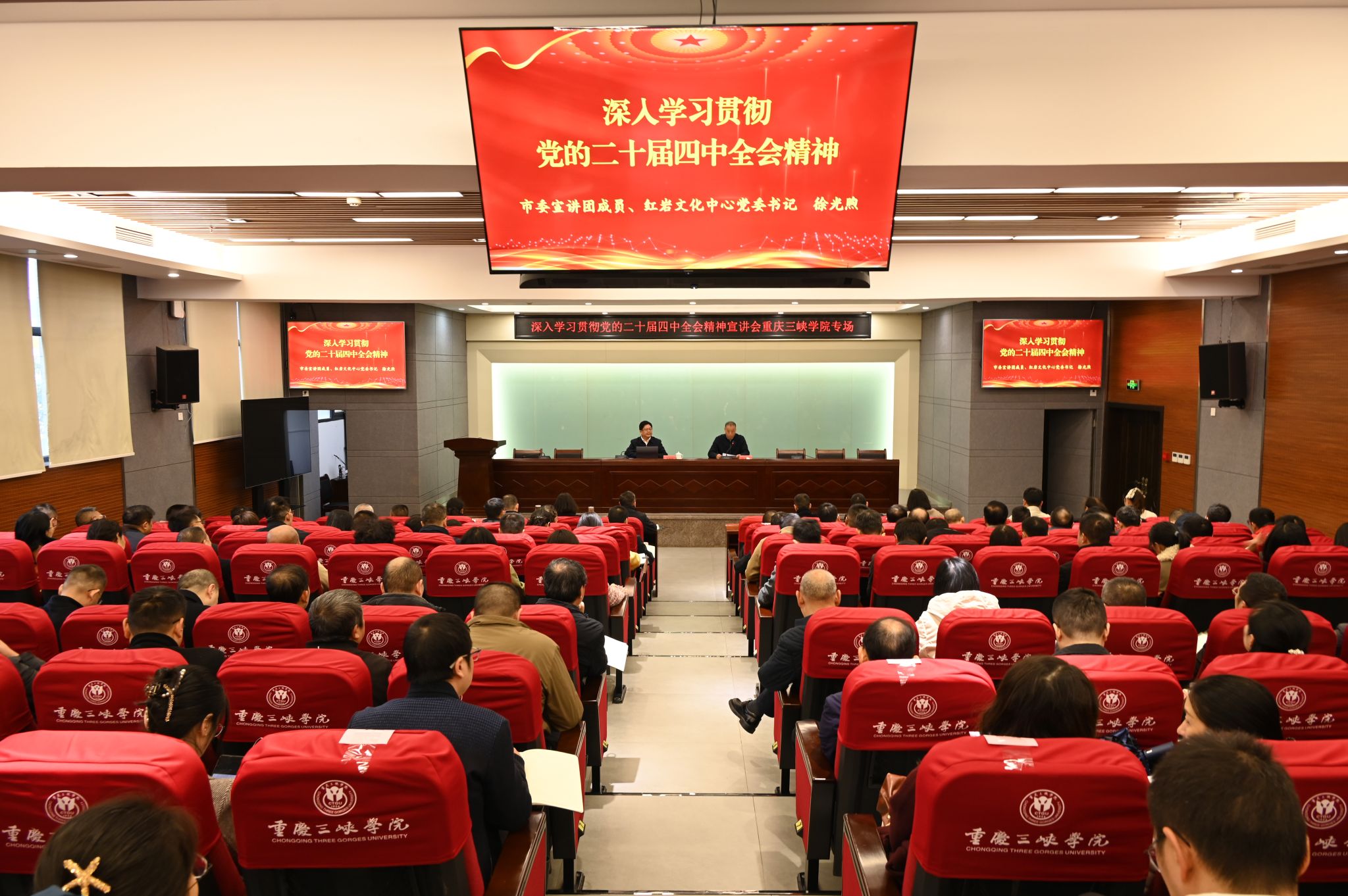 徐光煦全面系统地讲述了党的二十届四中全会精神与习近平总书记重要讲话精神,深刻阐述了党的二十届三中全会以来“4件大事”的重大意义,系统梳理了“十四五”期间取得的十二个方面成就,分析了“十五五”时期的重要地位、面临形势、指导思想、重大原则、重要目标等,特别是对“12个方面”的具体部署和加强党的全面领导这一根本保证进行了重点解读。整个报告紧密结合重庆市情与高校发展实际,针对性强,为与会者准确把握关键要点提供了指导。
