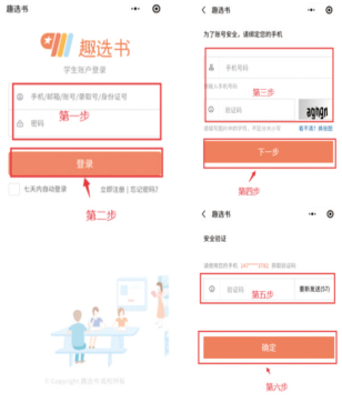 4)登录页面:输入账号密码→点击登录;学生第一次登录账号需要绑定手机号码→获取手机短信码并进行验证→学生确认信息→点击“确定”