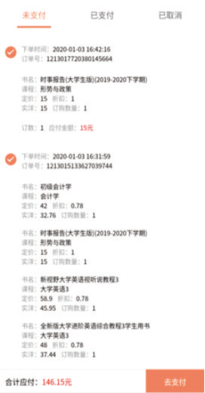 6)教材费支付:登录成功后,界面自动进入我的订单,点击右下角“去支付”。系统弹出对话框,提示核对确认教材信息,点击确认支付即可完成支付。