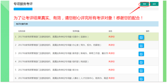 保存成功后会自动关闭当前界面,返回考评列表界面,点击“刷新”按钮即可刷新已评价的记录。