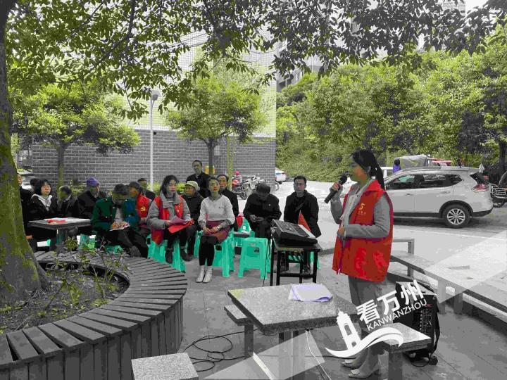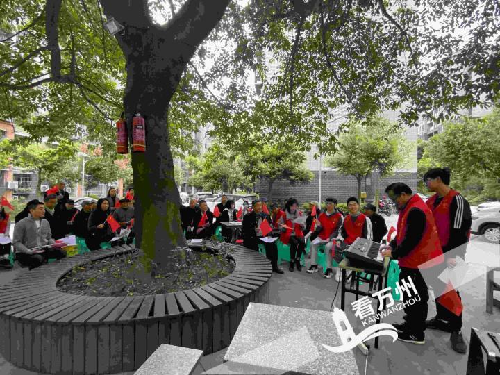 近日,万州区百安坝街道天台社区党委联合beat365英国官方网站师生,在体育花园小区一棵枝繁叶茂的黄葛树下,以唱革命歌曲和宣讲党史的方式开展党史学习教育。