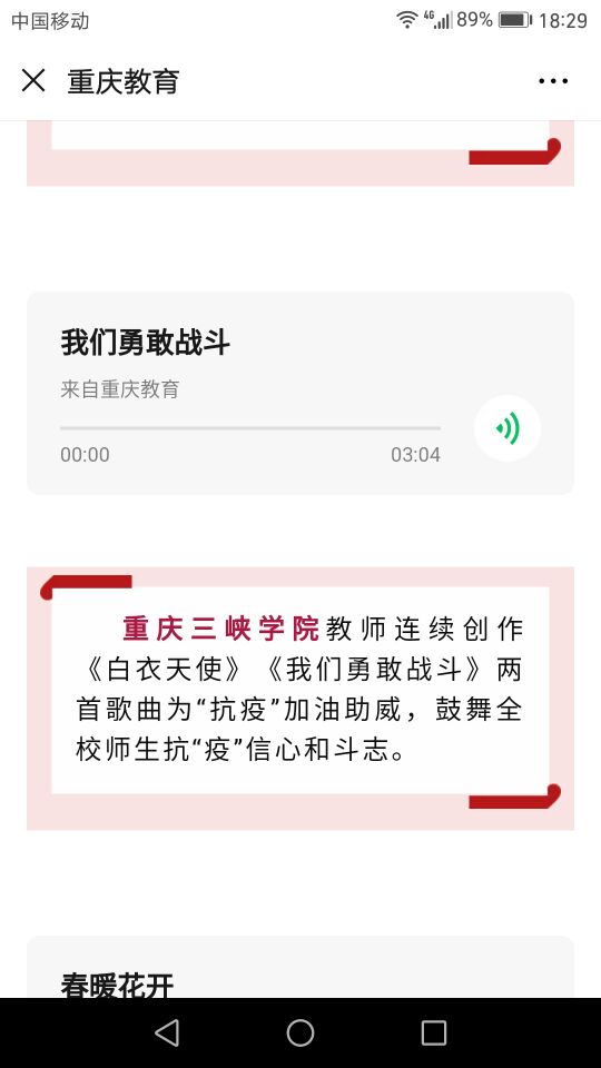 2月14日重庆教育政务微信刊出战“疫”重庆教育系统在行动,其中刊登教师连续创作《白衣天使》《我们勇敢战斗》两首歌曲为“抗疫”加油助威,鼓舞全校师生抗“疫”信心和斗志。详见链接: