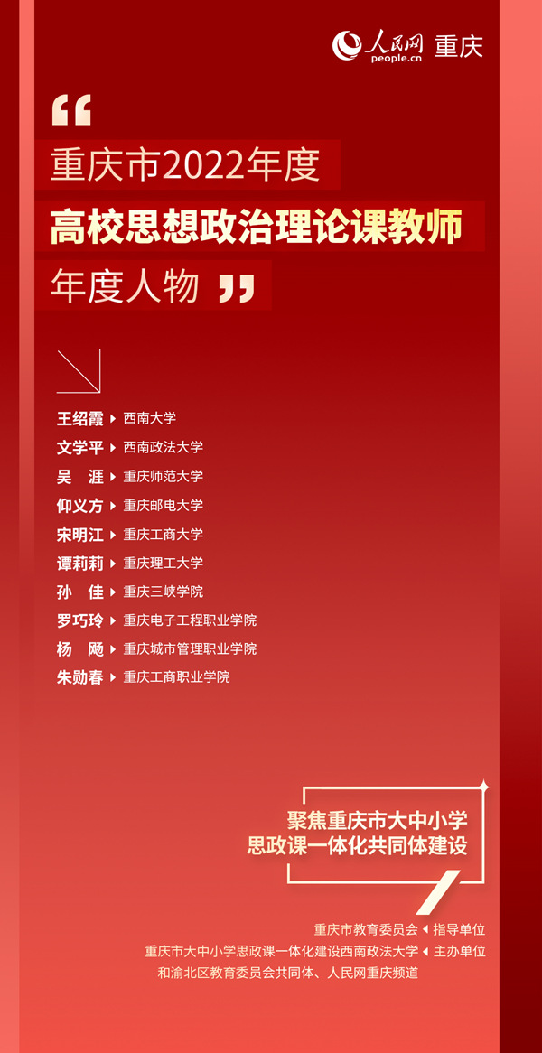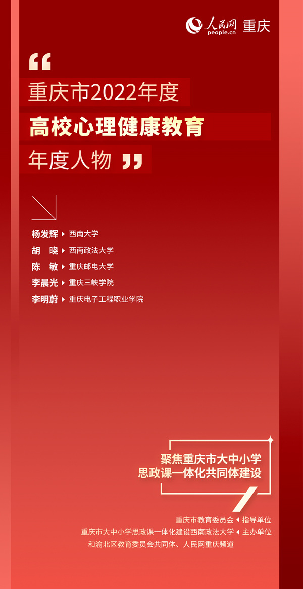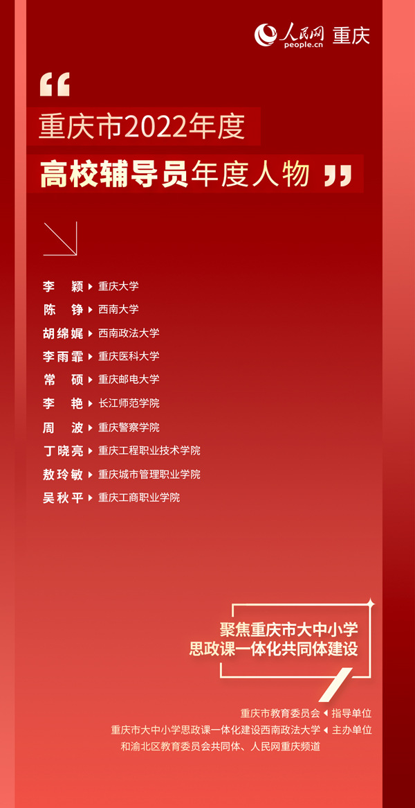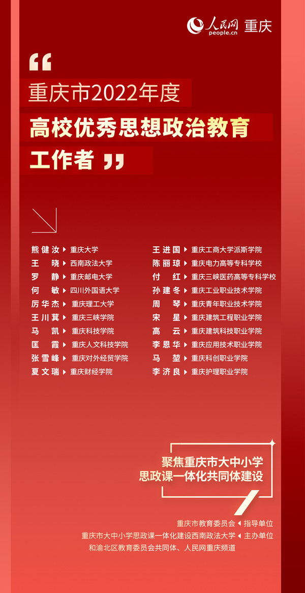 近日,据重庆市教委消息,经学校申报、专家评审,重庆市2022年度高校思想政治工作“年度人物”名单正式公布。