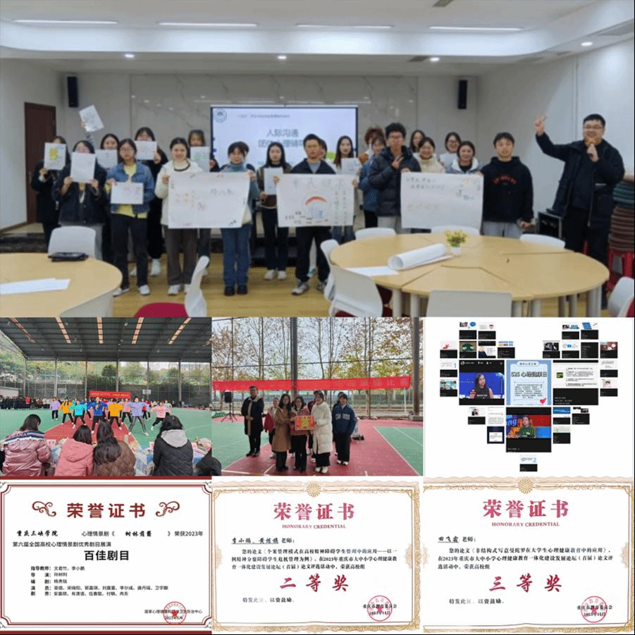 学校整合资源,部门联动,同向发力,成立教育理论教研部、心理健康教育教研室和大学生心理协会,各班设心理委员1名,各二级学院建心理工作站1个,在学生社区建立峡江春雨工作坊4个、辅导员工作室4个、心理室1间,实现各学院和学生社区全覆盖。加入重庆市社会心理学会、中国高等教育学会辅导员工作专委会、劳动教育专委会和学生工作研究分会,为心理教师搭建交流平台,鼓励支持心理教师参加各级培训学习,打通心理教师职业发展通道,建立沙龙研讨、教研教改、评比展示、晋升晋级等工作机制,充分调动心理育人队伍积极性、主动性、创造性。学校当选为全国高校心理委员研究协作组理事单位,3名同学获评全国百佳心理委员,10余篇论文在重庆市大中小学心理健康教育一体化建设发展论坛等活动中获奖。
