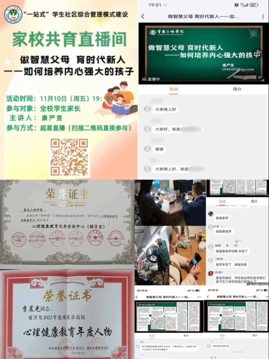 学校依托“今日校园”App、心理测评软件和学生管理信息系统,运用大数据技术,数字赋能心理育人工作。学校领导带头包片,对学生社区实施网格化管理,领导干部联系学生班级、寝室、社团,机关处室联系学生班级,广大教职工关心关爱学生,构建全员全程全方位“三全”育人格局。学校通过“家校直播间”直播、电话沟通、家访、推送信息等途径,向家长宣传心理知识,争取家长的理解支持配合。学校和重庆大学附属三峡医院平湖分院签订战略合作协议,专业医师每周四下午到校坐诊,为学生就医开辟绿色通道。学校鼓励学生发扬三峡人吃苦耐劳、乐观豁达的品格,激励学生爱国爱党,向上向善,勇于攀登,坚韧不拔,勇往直前,感恩奉献,创新超越。学校心理中心被市委宣传部评为“甜甜虎”优秀心理咨询中心,1名教师获评重庆高校心理健康教育年度人物,学生获得第十八届“挑战杯”全国大学生课外学术科技作品竞赛三等奖、第十五届全国大学生广告艺术大赛二等奖、2023年全国大学生电子设计竞赛一等奖、中国大学生年度人物入围奖等荣誉。