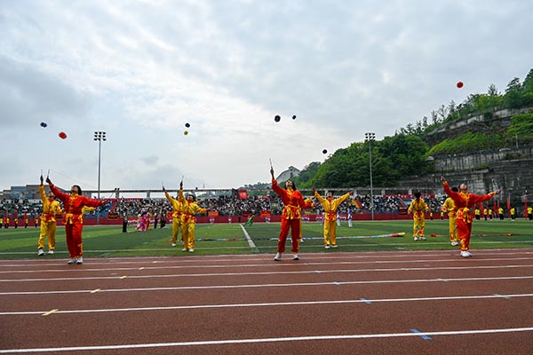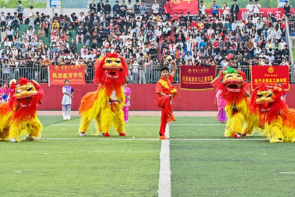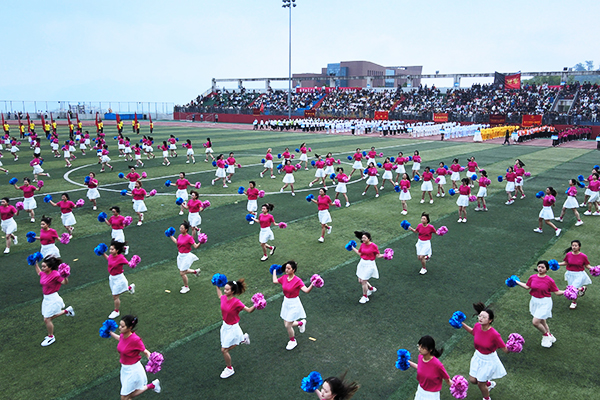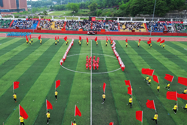 随后,学校师生带来了精彩纷呈的文体表演。开场节目《开门红》展示出中华民族自强不息、顽强拼搏的精神;师生们共同表演的《摆手舞》节奏欢快,动感极强;《武术空竹舞破苍穹》里的刚柔并济,《太极拳比赛》里的内外兼修,既是对文化的传承,也是对健康理念的传递;兼具力量与美感的《啦啦操》展现着学子们青春无限的活力;在《龙腾狮跃耀三峡》中,动作刚劲的舞狮代表着力量与健康,灵活多变的舞龙代表着不屈与坚韧,传递了运动的精神火炬;最后的大合唱《我和我的祖国》里,学子们用歌声表达着对祖国的热爱。