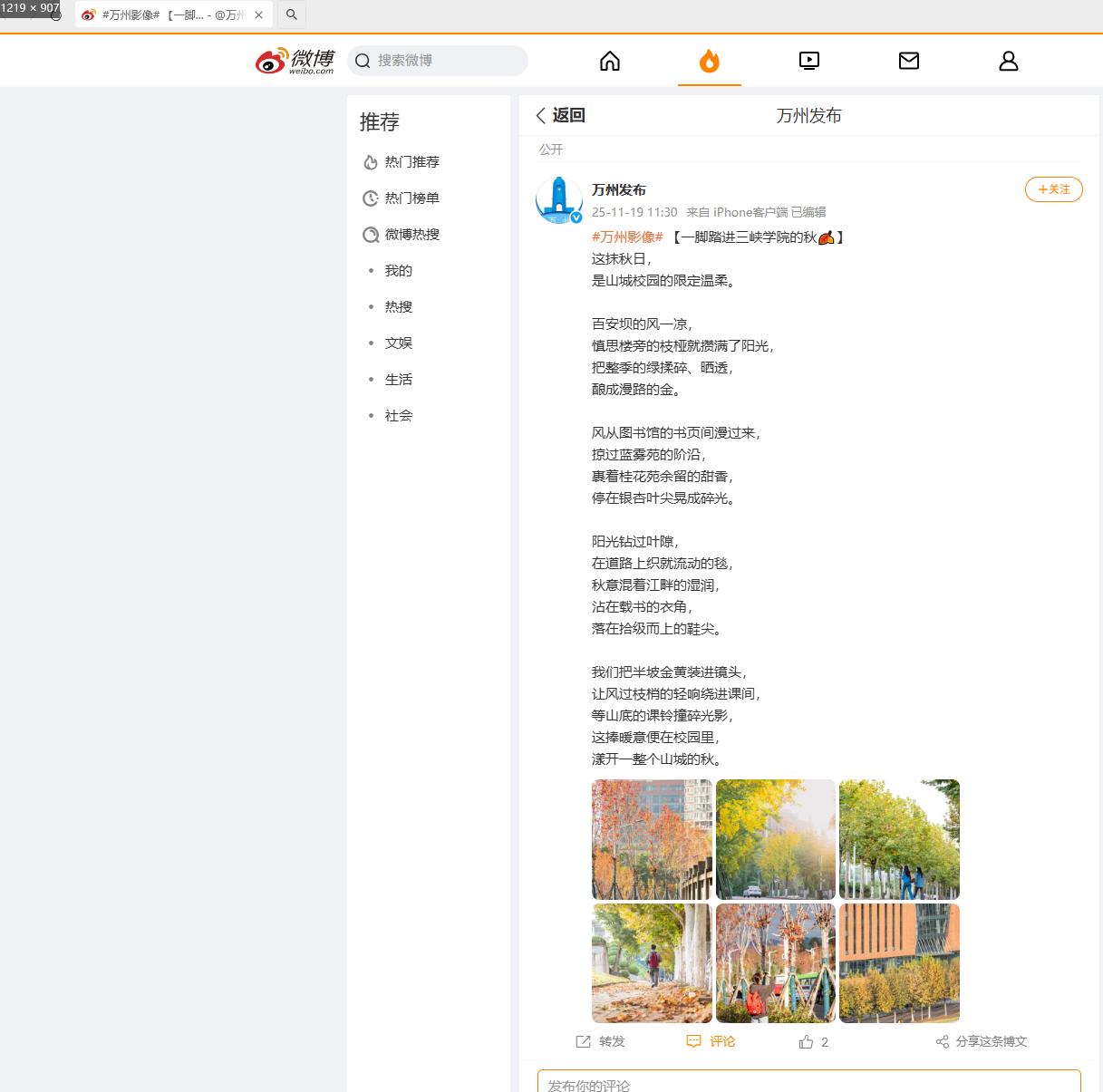 下一条:2025年11月19日《三峡融媒 微博》:#万州城事# 一脚踏进三峡学院的美景