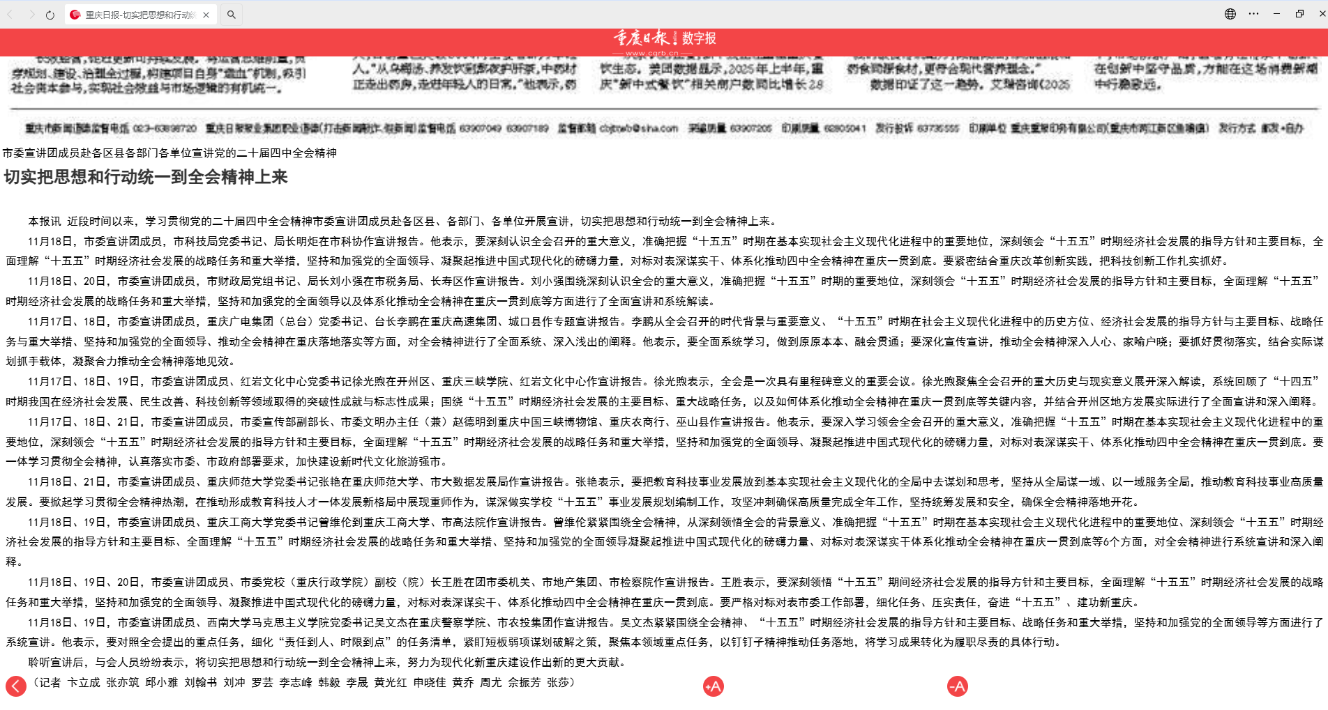 2025年11月25日《重庆日报》:市委宣讲团成员赴各区县各部门各单位宣讲党的二十届四中全会精神 切实把思想和行动统一到全会精神上来