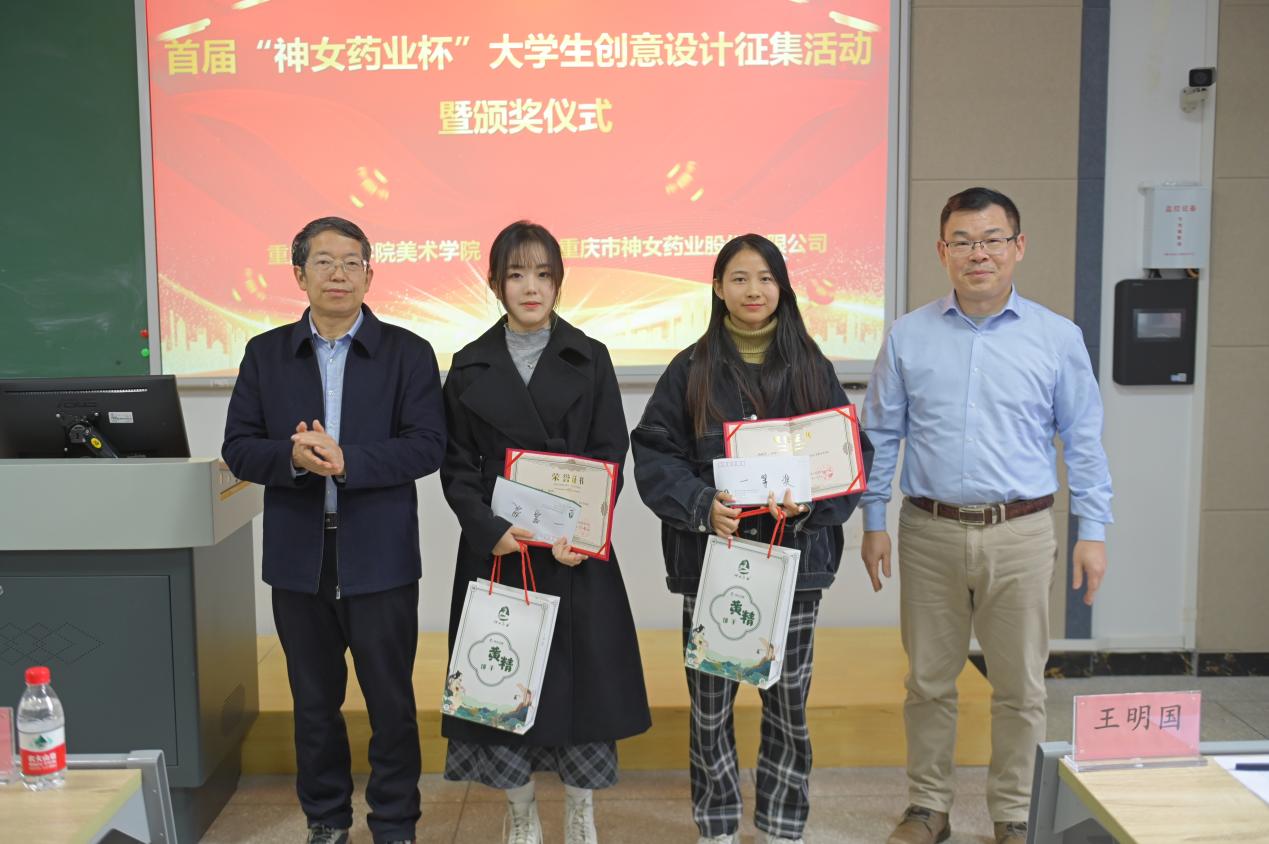 本次大学生创意设计征集活动由美术学院与神女药业股份有限公司携手举办,是美术学院推动校企合作、深化产学研用的成果之一,也是针对设计类专业“工作室制+导师制+项目制”人才培养改革的探索。活动期间,收到近千件作品,最终评出一等奖2名、二等奖4名、三等奖5名、优秀奖26名、优秀指导教师2名。祁俊生、重庆市神女药业股份有限公司总经理吴泽辉等领导为获奖学生颁奖。