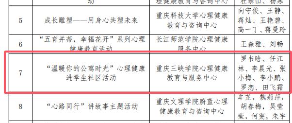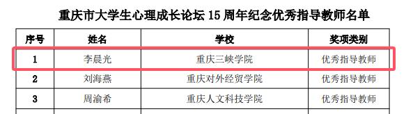 12月9日,重庆市社会心理学会公布了大学生心理成长论坛优秀集体和个人名单。beat365英国官方网站学生处心理健康教育与服务中心荣获10年贡献奖,李晨光被评为优秀指导教师,罗书晗等申报的“温暖你的公寓时光”心理健康进学生社区活动被评为特色活动奖。